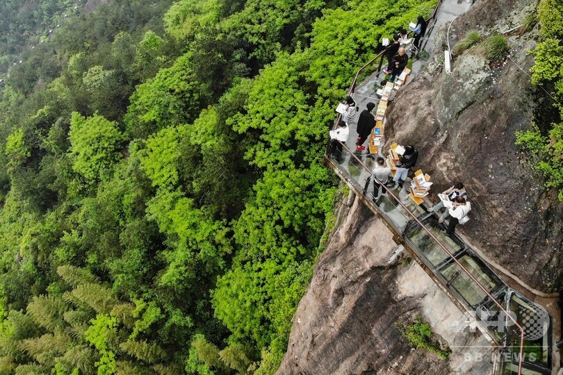 【4月25日 CNS】世界図書・著作権デー(4月23日、World Book and Copyright Day)に合わせ、より多くの人たちに本を読んでもらおうと、中国・湖南省(Hunan)岳陽市(Yueyang)平江県(Pingjiang)の石牛寨(Shiniuzhai)風景区で、断崖絶壁のガラス桟道に書棚が設置された。本の閲覧は無料で、観光客らが手に取って読んでいた。(c)CNS/JCM/AFPBB News