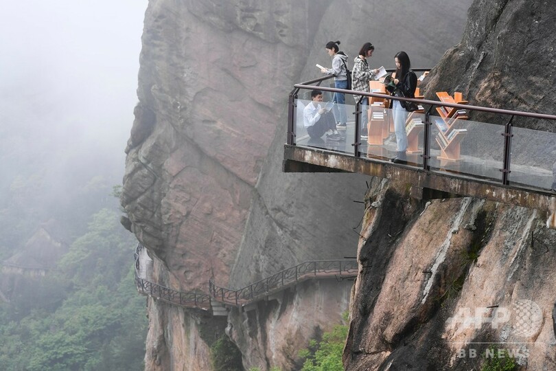 【4月25日 CNS】世界図書・著作権デー(4月23日、World Book and Copyright Day)に合わせ、より多くの人たちに本を読んでもらおうと、中国・湖南省(Hunan)岳陽市(Yueyang)平江県(Pingjiang)の石牛寨(Shiniuzhai)風景区で、断崖絶壁のガラス桟道に書棚が設置された。本の閲覧は無料で、観光客らが手に取って読んでいた。(c)CNS/JCM/AFPBB News