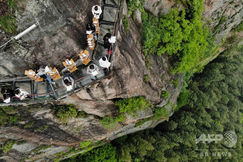 【4月25日 CNS】世界図書・著作権デー(4月23日、World Book and Copyright Day)に合わせ、より多くの人たちに本を読んでもらおうと、中国・湖南省(Hunan)岳陽市(Yueyang)平江県(Pingjiang)の石牛寨(Shiniuzhai)風景区で、断崖絶壁のガラス桟道に書棚が設置された。本の閲覧は無料で、観光客らが手に取って読んでいた。(c)CNS/JCM/AFPBB News