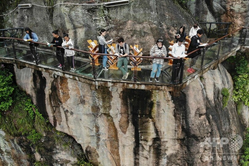 【4月25日 CNS】世界図書・著作権デー(4月23日、World Book and Copyright Day)に合わせ、より多くの人たちに本を読んでもらおうと、中国・湖南省(Hunan)岳陽市(Yueyang)平江県(Pingjiang)の石牛寨(Shiniuzhai)風景区で、断崖絶壁のガラス桟道に書棚が設置された。本の閲覧は無料で、観光客らが手に取って読んでいた。(c)CNS/JCM/AFPBB News
