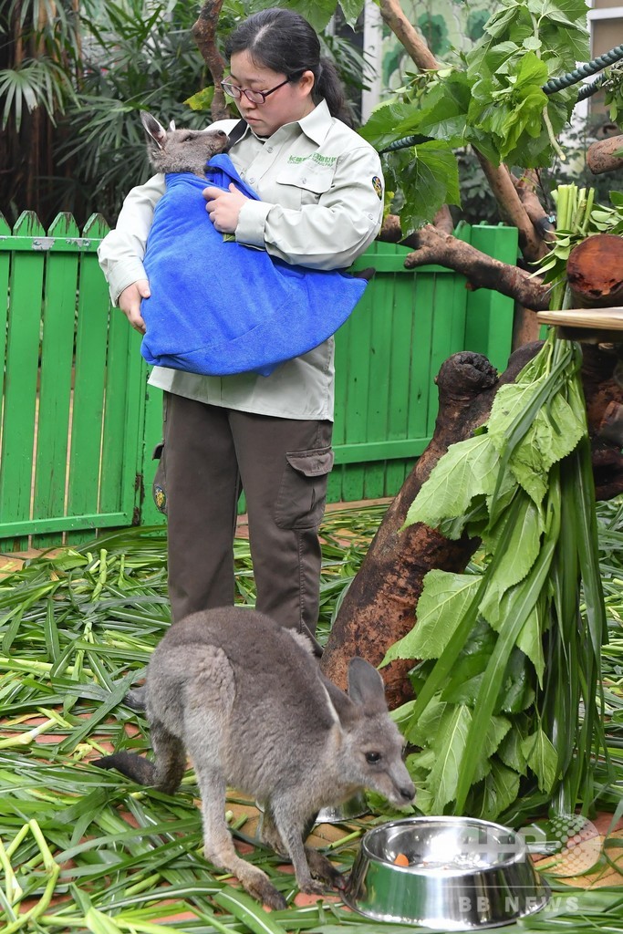 動物園では赤ちゃんカンガルーを人工的に飼育するため、カンガルーのおなかの袋を模した袋を製作し、赤ちゃんカンガルーを入れた。飼育員は袋を体の前にかけ、母親カンガルーが活動している感じを出すためにずっと動き続けていた。(c)CNS/JCM/AFPBB News