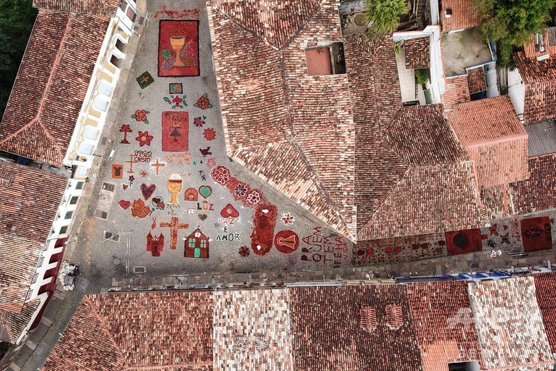 【5月6日 AFP】ブラジル・ミナスジェライス(Minas Gerais)州の古都オウロプレト(Ouro Preto)で、キリスト教の祝日イースター(Easter、復活祭)の行進を前に、通りを彩るおがくずのカーペットをとらえた空撮写真。地元住民や観光客らが、色付けしたおがくず約60トン分を用いて通りを飾り付けた。(c)AFP