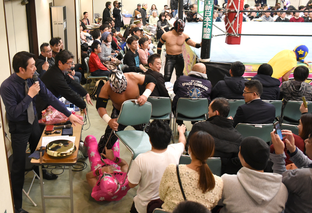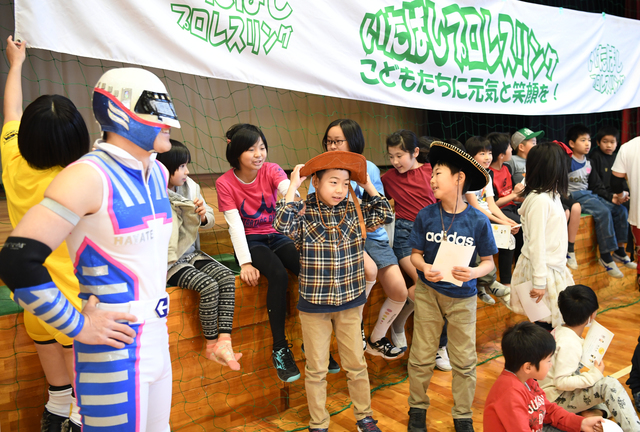 「みんなで力を合わせると強い。その力で困った人を助けてあげよう。『やっつけてやろう』ではだめだよ」。いたばしプロレスリング代表のはやて(Hayate)さん(54)は、レスラーに体当たりして興奮気味の子どもたちに、諭すように話した。