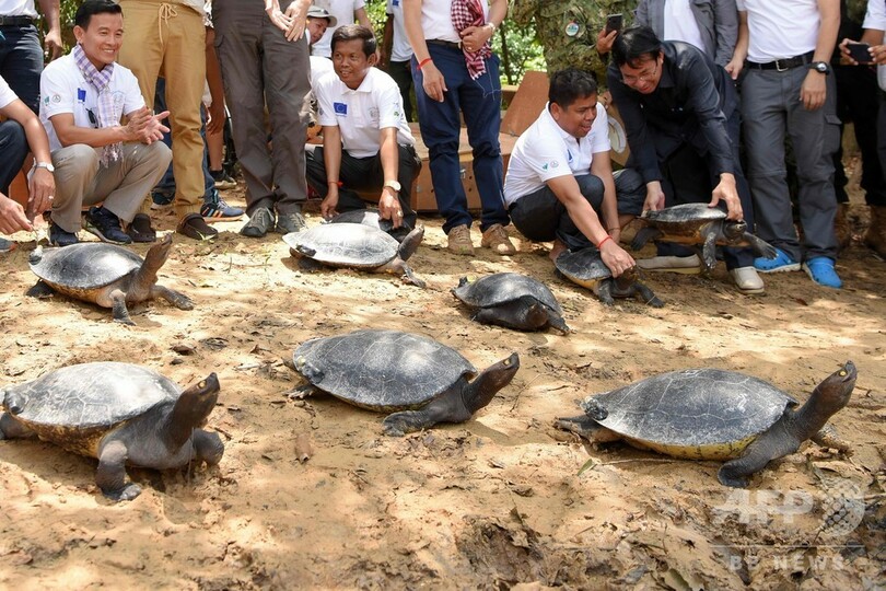 希少なカメ、ロイヤル・タートル20匹を川へ、繁殖に期待 カンボジア