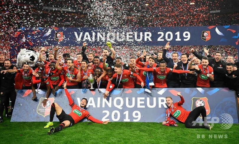 一方、見事な逆転優勝を飾ったレンヌはファンも含めて喜びを爆発させた。高級品の販売で財を成した国内有数の富豪、フランソワ・アンリ・ピノー(Francois-Henri Pinault)氏をオーナーに持ちながら、これまでタイトルにほとんど縁のなかったレンヌだが、これで1971年のフランス杯以来、約50年ぶりのタイトルを獲得し、来季のヨーロッパリーグ(UEFA Europa League 2019-20)の出場権も手に入れた。(c)AFP