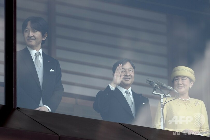 天皇陛下はモーニング、皇后陛下はエレガントな黄色のロングドレスと、それに合わせた帽子と真珠のネックレス姿だった。NHKによると、天皇陛下は皇族方と共に同日中に6回、宮殿のベランダに立たれる予定になっている。(c)AFP