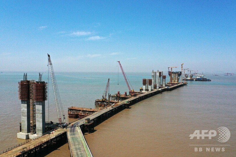 馬目(Mamu)地区海域の高さ約40メートルの主塔「N03」の最上部でも、橋脚部の最後のコンクリート注入の準備を行っていた。労働節(メーデー、May Day)連休の期間、寧波・舟山港とつながる幹線道路の建設を進めるため、作業員は大橋建設の第一線を離れることなく奮闘していた。(c)CNS/JCM/AFPBB News