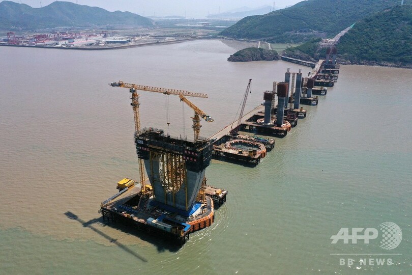 馬目(Mamu)地区海域の高さ約40メートルの主塔「N03」の最上部でも、橋脚部の最後のコンクリート注入の準備を行っていた。労働節(メーデー、May Day)連休の期間、寧波・舟山港とつながる幹線道路の建設を進めるため、作業員は大橋建設の第一線を離れることなく奮闘していた。(c)CNS/JCM/AFPBB News