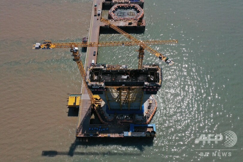 馬目(Mamu)地区海域の高さ約40メートルの主塔「N03」の最上部でも、橋脚部の最後のコンクリート注入の準備を行っていた。労働節(メーデー、May Day)連休の期間、寧波・舟山港とつながる幹線道路の建設を進めるため、作業員は大橋建設の第一線を離れることなく奮闘していた。(c)CNS/JCM/AFPBB News