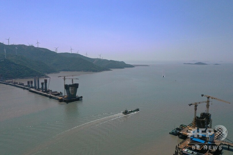 馬目(Mamu)地区海域の高さ約40メートルの主塔「N03」の最上部でも、橋脚部の最後のコンクリート注入の準備を行っていた。労働節(メーデー、May Day)連休の期間、寧波・舟山港とつながる幹線道路の建設を進めるため、作業員は大橋建設の第一線を離れることなく奮闘していた。(c)CNS/JCM/AFPBB News