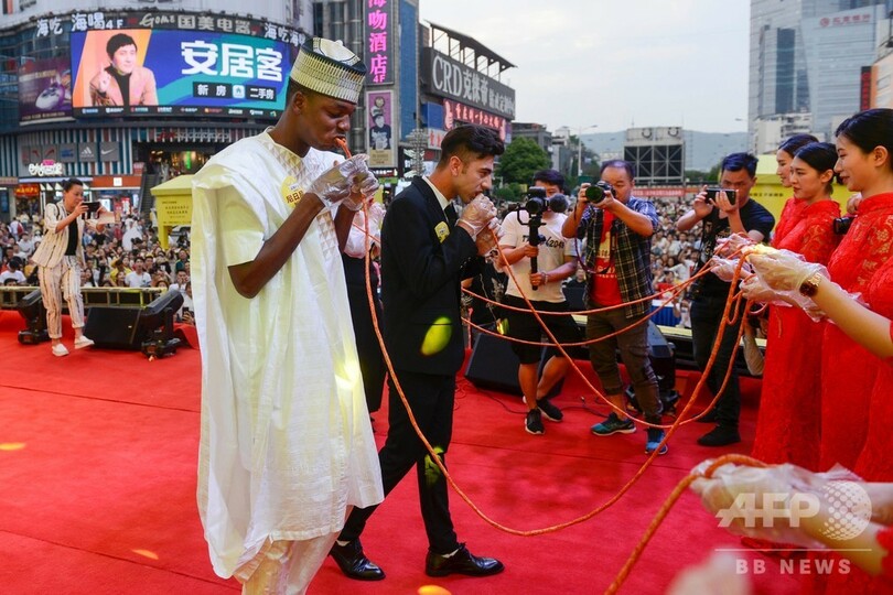 【5月12日 CNS】中国・湖南省(Hunan)長沙市(Changsha)の黄興路(Huangxing Road)で行われた、激辛のひも状スナック菓子「辣条(Latiao)」の早食い競争。中国、トルコ、ナイジェリアなど6か国から来た激辛食いの達人らが長さ5.2メートルの「辣条」に挑戦した。(c)CNS/JCM/AFPBB News