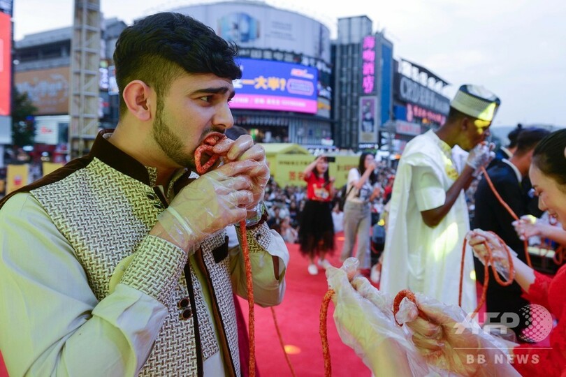 【5月12日 CNS】中国・湖南省(Hunan)長沙市(Changsha)の黄興路(Huangxing Road)で行われた、激辛のひも状スナック菓子「辣条(Latiao)」の早食い競争。中国、トルコ、ナイジェリアなど6か国から来た激辛食いの達人らが長さ5.2メートルの「辣条」に挑戦した。(c)CNS/JCM/AFPBB News