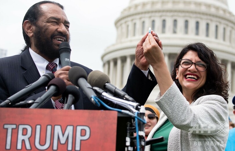 「私たちはきょう、1000万人分の(弾劾を求める)理由を手に、ここにいる」。アル・グリーン(Al Green)下院議員はこう宣言し、ラシダ・タリーブ(Rashida Tlaib)下院議員と一緒に署名の入ったフラッシュメモリーを掲げた。