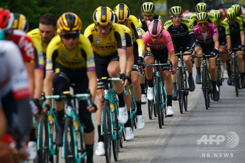一方、チーム・ユンボ・ビスマ(Team Jumbo Visma)のプリモシュ・ログリッチ(Primoz Roglic、スロベニア)はメイン集団でフィニッシュし、総合首位の座を維持している。(c)AFP