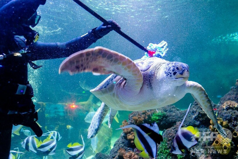 【5月16日 AFP】ドイツ北部ティメンドルファーシュトラント(Timmendorfer Strand)の水族館で14日、春の大掃除が行われた。飼育員が水槽に潜ってウミガメをブラシなどでこすったり、タコが食器用ブラシを抱え込んだりする様子が見られた。(c)AFP