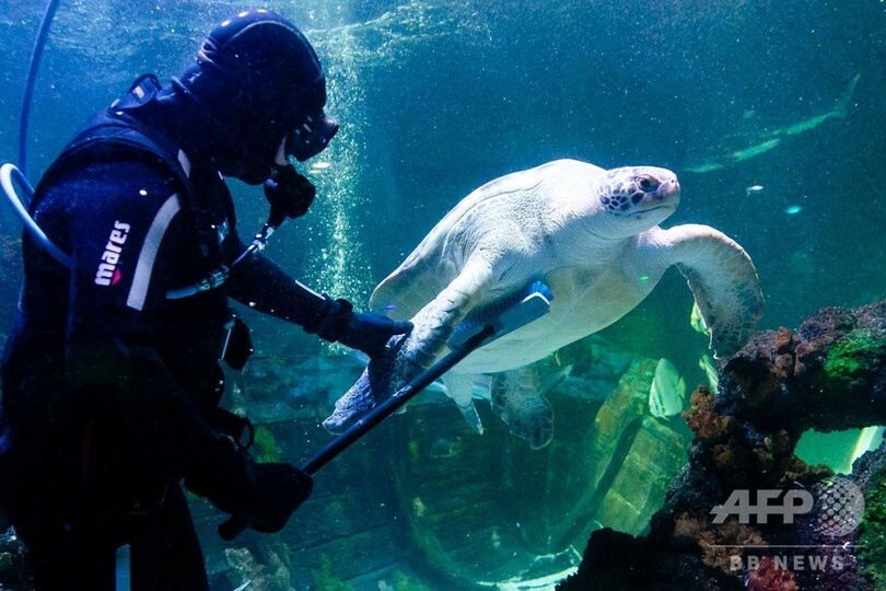 【5月16日 AFP】ドイツ北部ティメンドルファーシュトラント(Timmendorfer Strand)の水族館で14日、春の大掃除が行われた。飼育員が水槽に潜ってウミガメをブラシなどでこすったり、タコが食器用ブラシを抱え込んだりする様子が見られた。(c)AFP