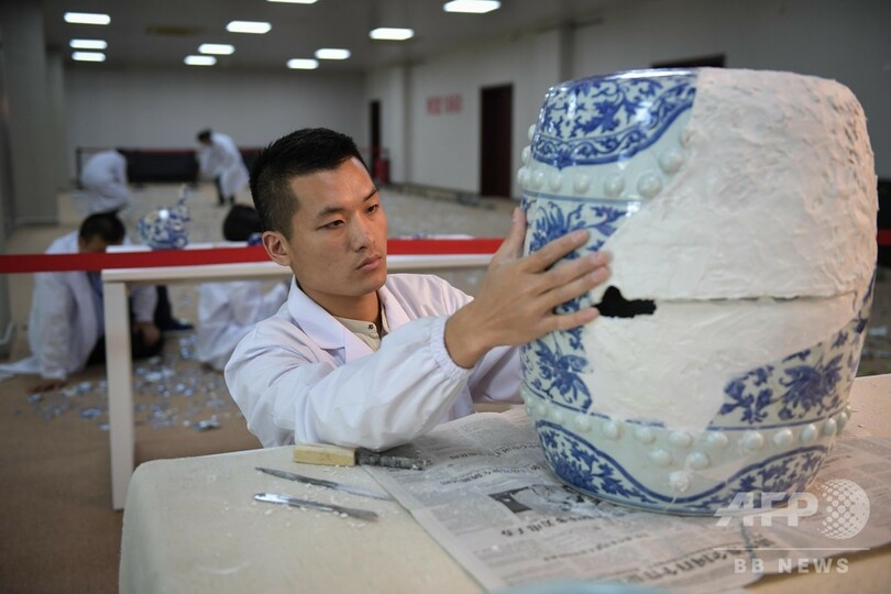 同プロジェクトの趣旨は、出土文化財の保護と修復の継続的推進と、関連文化の更なる復興を推進すること。同園では、破片を組み合わせて大まかな構造を復元した磁器6点を重点的に修復しており、完了後には一般公開する予定だ。(c)CNS/JCM/AFPBB News