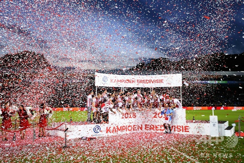 こうした結果により、5月5日にオランダ杯(Dutch Cup 2018-19)を制したアヤックスは17年ぶりの2冠達成を確実にし、この日の最終節ではPSVもヘラクレス・アルメロ(Heracles Almelo)に3-1で勝利したが、それに関係なく優勝が決まった。(c)AFP