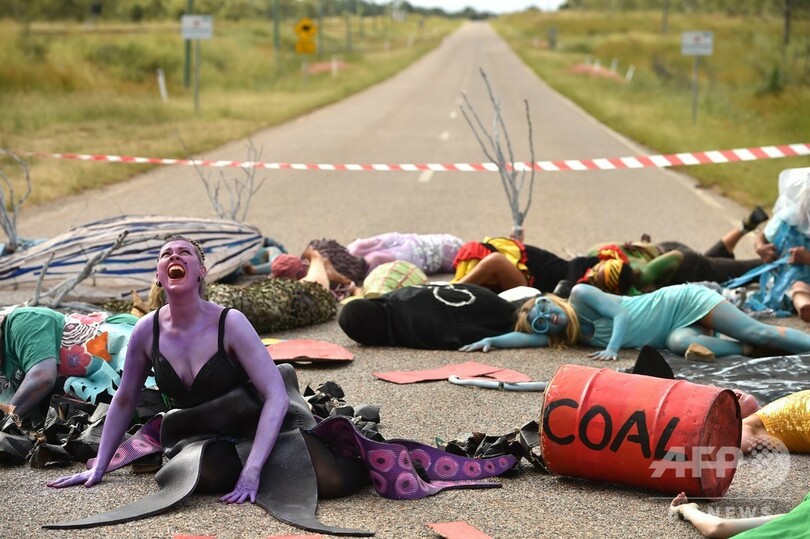 【5月20日 AFP】豪クイーンズランド(Queensland)州ボーエン(Bowen)近くのアボットポイント(Abbot Point)港へ通じる路上で、インド資本のアダニ・グループ(Adani Group)による炭鉱開発に抗議する環境活動家たち。同港からは、産出品の石炭が積み出される。(c)AFP