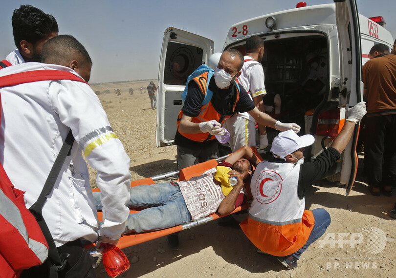 今年も境界フェンス沿いの複数か所で衝突が発生したが、去年よりははるかに小規模だった。ガザ保健省によると65人が負傷、うち16人が銃傷を負った。(c)AFP