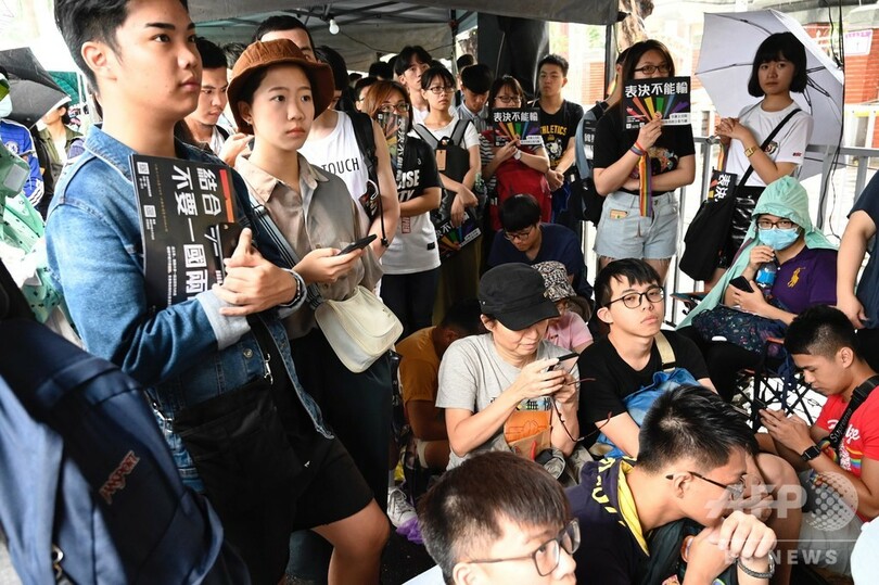 【5月17日 AFP】(更新、写真追加)台湾の立法院(議会)は17日、同性婚を合法化する法案の採決を行い、賛成多数で可決した。同性婚合法化はアジアで初めて。