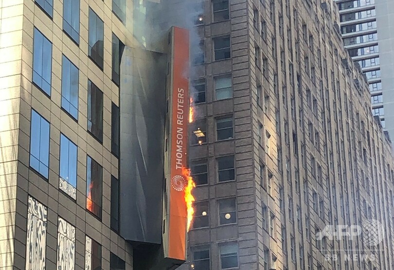 【5月19日 AFP】(写真追加)米ニューヨークで18日、タイムズスクエア(Times Square)名物の大型電子看板の一つから出火し、一時的に火災が発生した。