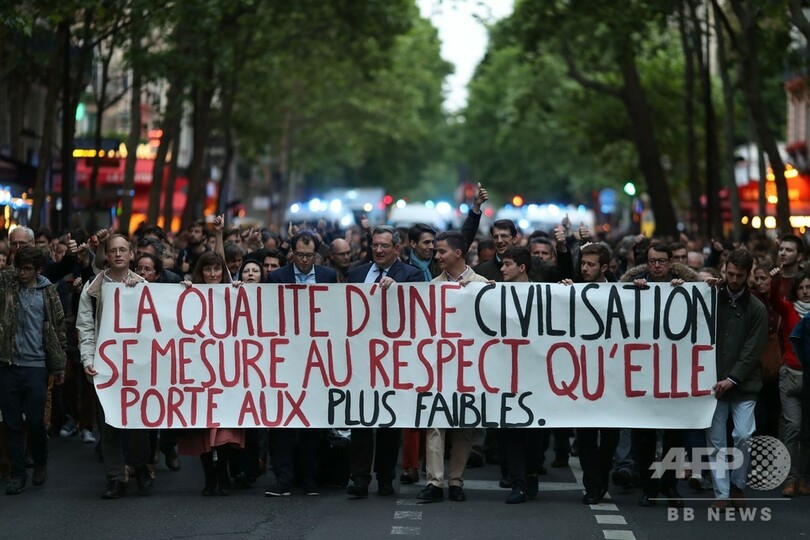 パリでは20日午後、マクロン大統領に介入を求めるデモ行進が行われ、参加者は大統領府に向かって行進した。(c)AFP/Renaud LAVERGNE