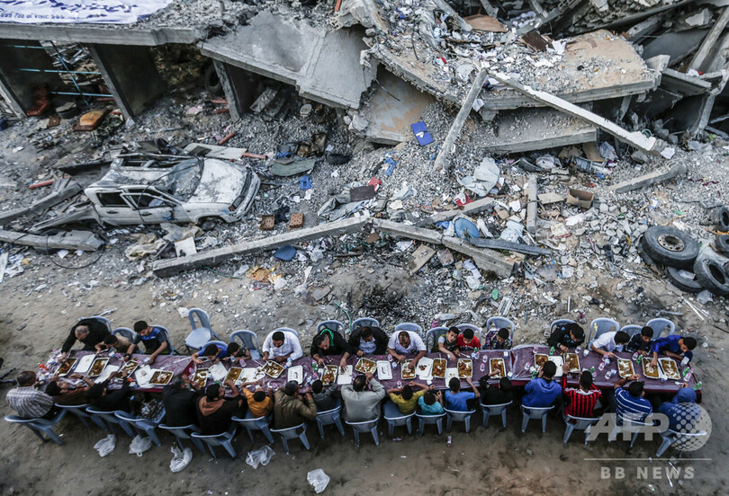 【5月25日 AFP】イスラム教の断食月「ラマダン(Ramadan)」中にパレスチナ自治区ガザ地区(Gaza Strip)で、断食後の食事を取るパレスチナ人家族。近くの建物は、イスラム原理主義組織ハマス(Hamas)とイスラエルの間で最近起きた武力衝突で破壊された。(c)AFP