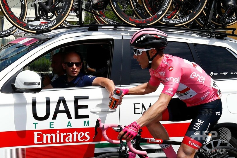 また、総合順位ではUTE(UAE TEAM EMIRATES)のヴァレリオ・コンティ(Valerio Conti、イタリア)が1位の座をキープしている。(c)AFP