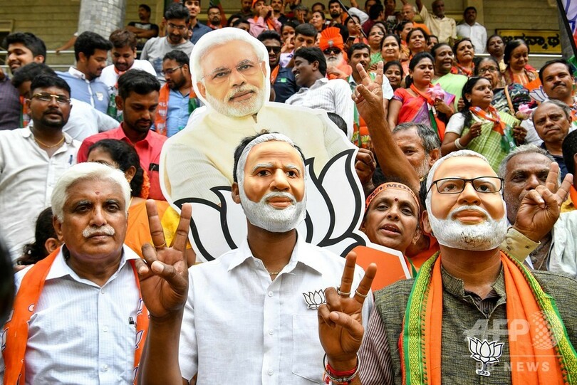 【5月23日 AFP】(更新)19日に投票が終了したインド総選挙は、23日に始まった開票作業が進む中、ナレンドラ・モディ(Narendra Modi)首相率いる与党のインド人民党(BJP)が過半数の議席を確保し圧勝する見通しとなったことから、同党が勝利を宣言した。