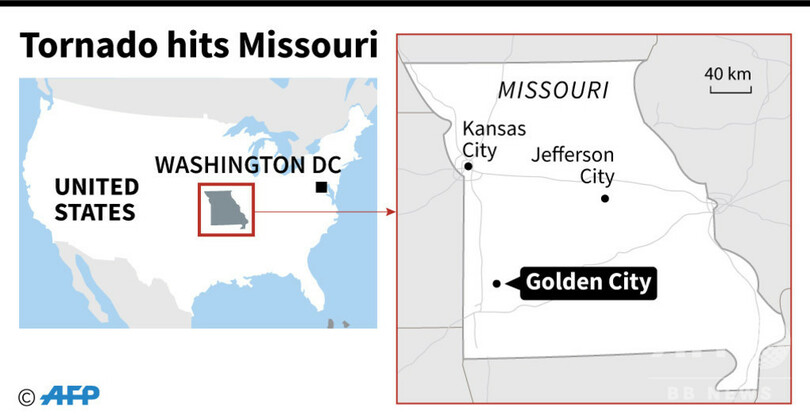 【5月23日 AFP】(写真追加)米ミズーリ州で22日、強力な竜巻が発生し、3人が死亡した。当局が翌23日、発表した。同州では送電線が切れて木々が倒れた他、窓ガラスが割れたり、路上にがれきが散乱したりする被害が出ている。