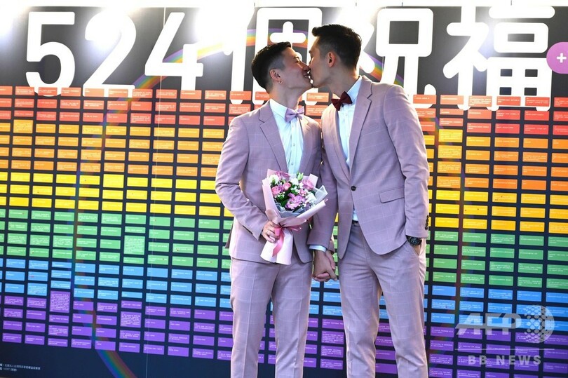 【5月24日 AFP】(写真追加)アジアで初めて同性婚が合法化された台湾で24日、同性カップルの婚姻受け付けが開始され、台北市内の行政機関に1番に到着して婚姻届を出した男性カップルの林玄(Shane Lin)さんと袁紹銘(Marc Yuan)さんが台湾の同性婚第1号となった。台湾のLGBT(性的少数者)たちは、結婚で同性カップルにも異性カップルと同等の権利を保障するよう、およそ30年にわたって運動を続けてきたが、その運動が実を結んだ歴史的な日となった。