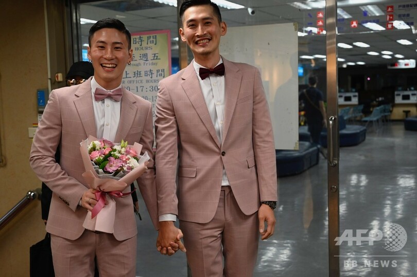 【5月24日 AFP】(写真追加)アジアで初めて同性婚が合法化された台湾で24日、同性カップルの婚姻受け付けが開始され、台北市内の行政機関に1番に到着して婚姻届を出した男性カップルの林玄(Shane Lin)さんと袁紹銘(Marc Yuan)さんが台湾の同性婚第1号となった。台湾のLGBT(性的少数者)たちは、結婚で同性カップルにも異性カップルと同等の権利を保障するよう、およそ30年にわたって運動を続けてきたが、その運動が実を結んだ歴史的な日となった。