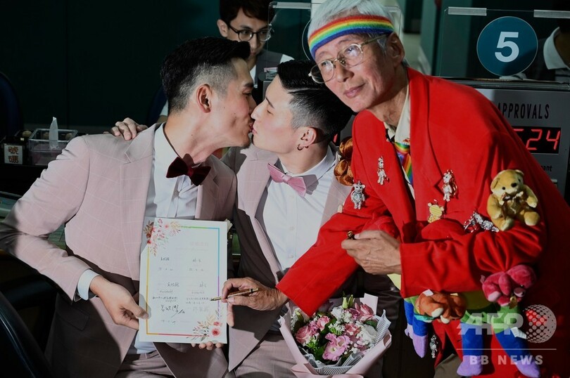 【5月24日 AFP】(写真追加)アジアで初めて同性婚が合法化された台湾で24日、同性カップルの婚姻受け付けが開始され、台北市内の行政機関に1番に到着して婚姻届を出した男性カップルの林玄(Shane Lin)さんと袁紹銘(Marc Yuan)さんが台湾の同性婚第1号となった。台湾のLGBT(性的少数者)たちは、結婚で同性カップルにも異性カップルと同等の権利を保障するよう、およそ30年にわたって運動を続けてきたが、その運動が実を結んだ歴史的な日となった。