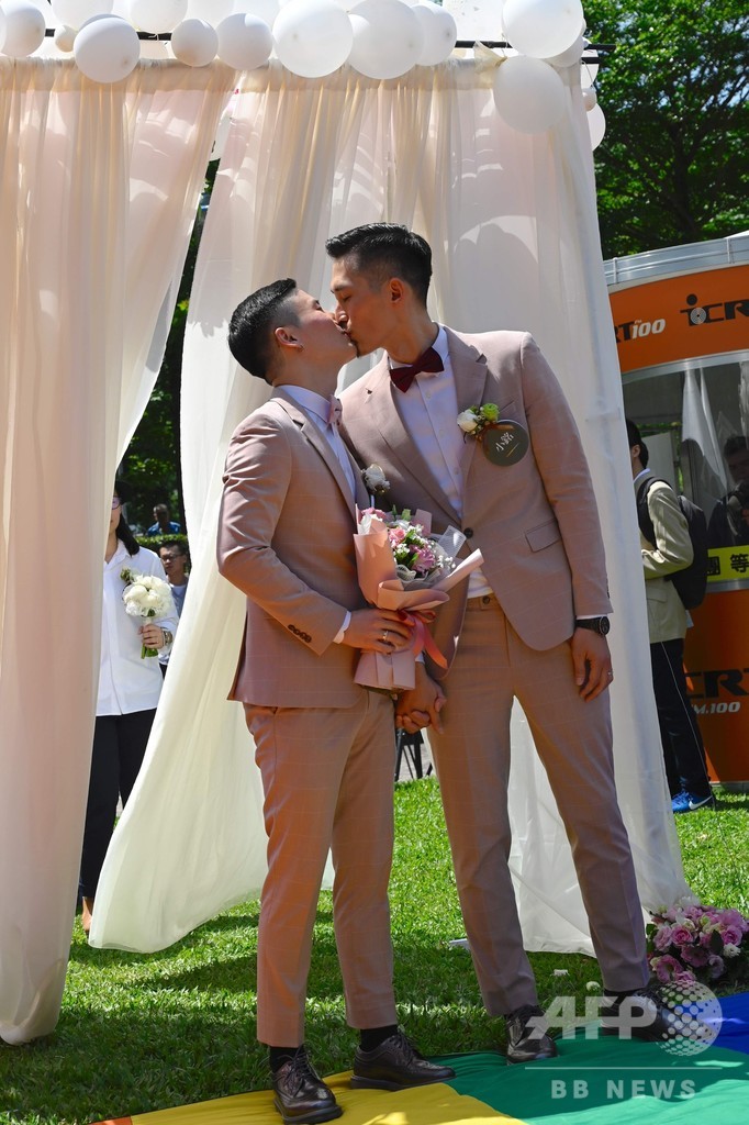 【5月24日 AFP】(写真追加)アジアで初めて同性婚が合法化された台湾で24日、同性カップルの婚姻受け付けが開始され、台北市内の行政機関に1番に到着して婚姻届を出した男性カップルの林玄(Shane Lin)さんと袁紹銘(Marc Yuan)さんが台湾の同性婚第1号となった。台湾のLGBT(性的少数者)たちは、結婚で同性カップルにも異性カップルと同等の権利を保障するよう、およそ30年にわたって運動を続けてきたが、その運動が実を結んだ歴史的な日となった。