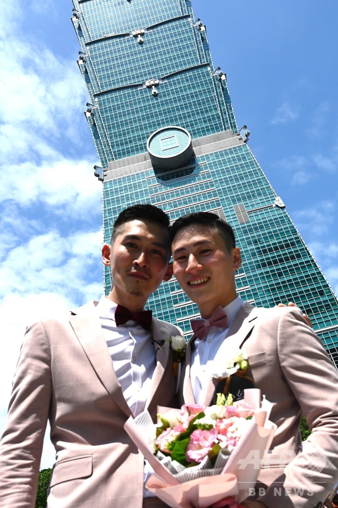 【5月24日 AFP】(写真追加)アジアで初めて同性婚が合法化された台湾で24日、同性カップルの婚姻受け付けが開始され、台北市内の行政機関に1番に到着して婚姻届を出した男性カップルの林玄(Shane Lin)さんと袁紹銘(Marc Yuan)さんが台湾の同性婚第1号となった。台湾のLGBT(性的少数者)たちは、結婚で同性カップルにも異性カップルと同等の権利を保障するよう、およそ30年にわたって運動を続けてきたが、その運動が実を結んだ歴史的な日となった。