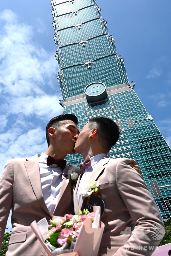 【5月24日 AFP】(写真追加)アジアで初めて同性婚が合法化された台湾で24日、同性カップルの婚姻受け付けが開始され、台北市内の行政機関に1番に到着して婚姻届を出した男性カップルの林玄(Shane Lin)さんと袁紹銘(Marc Yuan)さんが台湾の同性婚第1号となった。台湾のLGBT(性的少数者)たちは、結婚で同性カップルにも異性カップルと同等の権利を保障するよう、およそ30年にわたって運動を続けてきたが、その運動が実を結んだ歴史的な日となった。