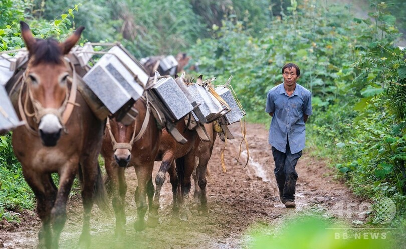 隊のリーダーを務める王連品(Wang Lianpin)さんは、13人の隊員と20頭以上の馬をまとめる責任者で、王さんのキャラバン隊は年中、中国各省・区の観光地遊歩道や電力施設の建設作業など、山間部の工事現場で仕事に追われながら、今年で10年目を迎える。(c)CNS/JCM/AFPBB News