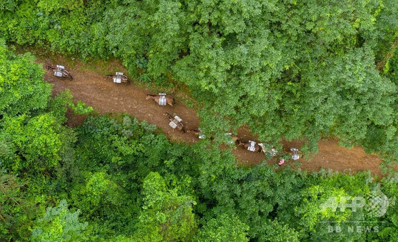 【6月5日 CNS】中国江西省(Jiangxi)新余市(Xinyu)渝水区界水郷の北山山道では、キャラバン隊が砂や石を馬に積み、行き来している。