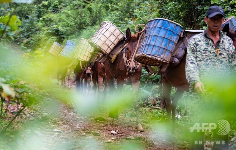 隊のリーダーを務める王連品(Wang Lianpin)さんは、13人の隊員と20頭以上の馬をまとめる責任者で、王さんのキャラバン隊は年中、中国各省・区の観光地遊歩道や電力施設の建設作業など、山間部の工事現場で仕事に追われながら、今年で10年目を迎える。(c)CNS/JCM/AFPBB News