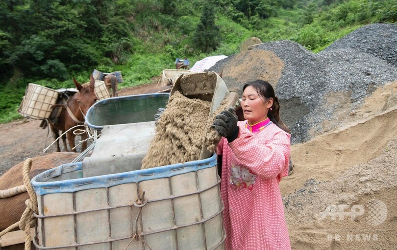 【6月5日 CNS】中国江西省(Jiangxi)新余市(Xinyu)渝水区界水郷の北山山道では、キャラバン隊が砂や石を馬に積み、行き来している。