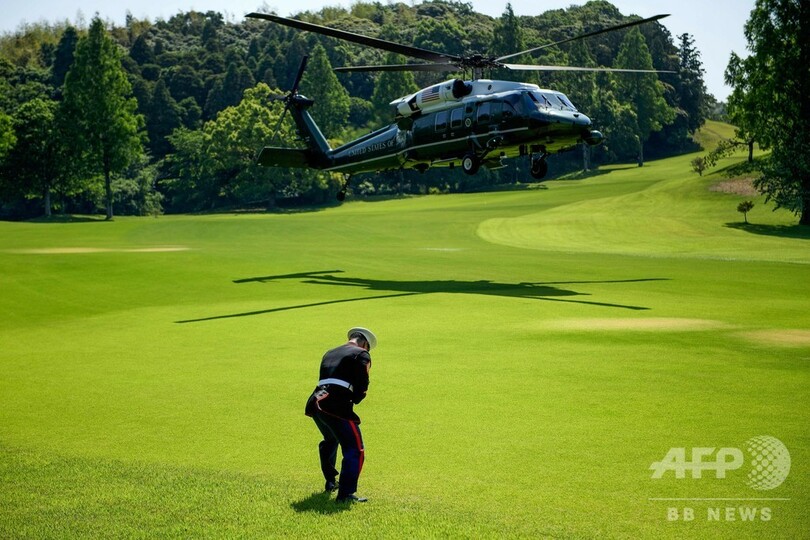 【5月26日 AFP】(更新、写真追加)日本を訪問中のドナルド・トランプ(Donald Trump)米大統領は26日午前、大統領専用ヘリコプター「マリーンワン(Marine One)」で千葉県の茂原カントリー倶楽部(Mobara Country Club)を訪れ、安倍晋三(Shinzo Abe)首相の出迎えを受けた。
