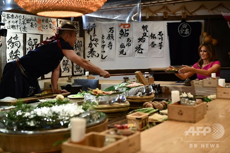 【5月26日 AFP】来日中のドナルド・トランプ(Donald Trump)米大統領は26日の夕方、メラニア(Melania Trump)夫人と共に六本木の炉端焼き店を訪れた。夕食には、安倍晋三(Shinzo Abe)首相と昭恵(Akie Abe)夫人も同席した。(c)AFP