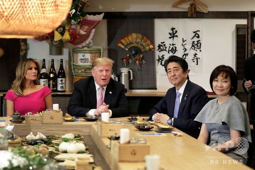 【5月26日 AFP】来日中のドナルド・トランプ(Donald Trump)米大統領は26日の夕方、メラニア(Melania Trump)夫人と共に六本木の炉端焼き店を訪れた。夕食には、安倍晋三(Shinzo Abe)首相と昭恵(Akie Abe)夫人も同席した。(c)AFP