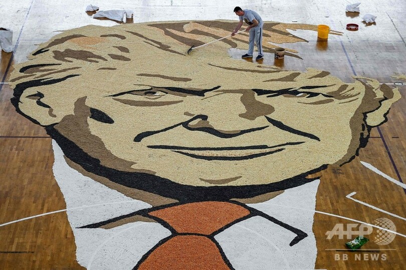 【5月27日 AFP】コソボのジャコバ(Gjakova)で25日、同国のアーティスト、アルケント・ポジグ(Alkent Pozhegu)氏が穀物の種を用い、米国のドナルド・トランプ(Donald Trump)大統領のモザイク画を制作した。面積560平方メートルのインスタレーションは、ギネス世界記録(Guiness World Records)の「最も大きな穀物画」の記録更新を目指して制作された。(c)AFP