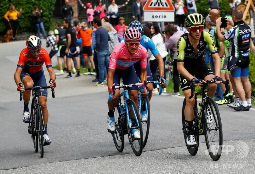 しかし、ピンクジャージーを争うチーム・ユンボ・ビスマ(Team Jumbo Visma)のプリモシュ・ログリッチ(Primoz Roglic、スロベニア)は終盤の下り坂で落車し、タイムを40秒失った。(c)AFP