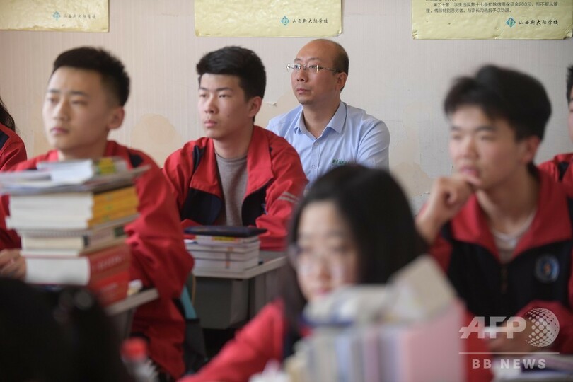 【6月8日 CNS】中国・山西省(Shanxi)太原市(Taiyuan)で、高校3年の生徒らと一緒に受験勉強をする王世卿(Wang Shiqing)さん(40)。