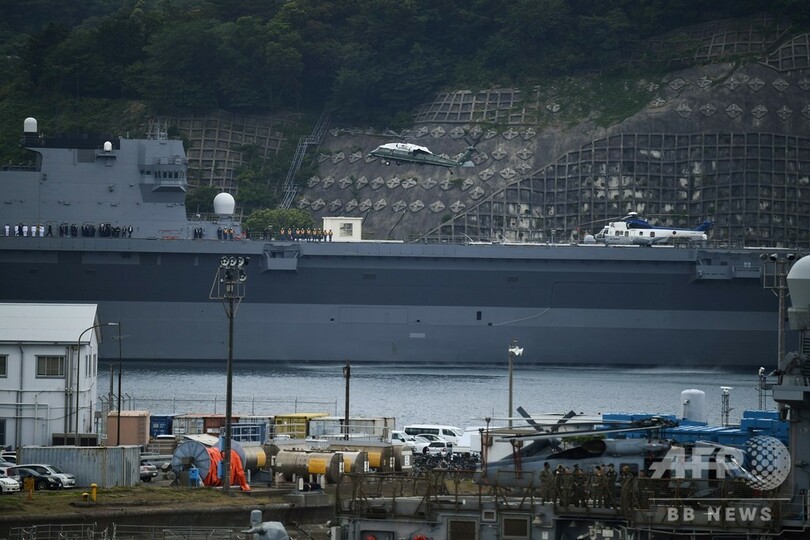 【5月28日 AFP】(更新、写真追加)訪日中のドナルド・トランプ(Donald Trump)米大統領は最終日となる28日、神奈川県横須賀市の横須賀基地を訪問し、海上自衛隊の護衛艦「かが(JS Kaga)」を視察した。