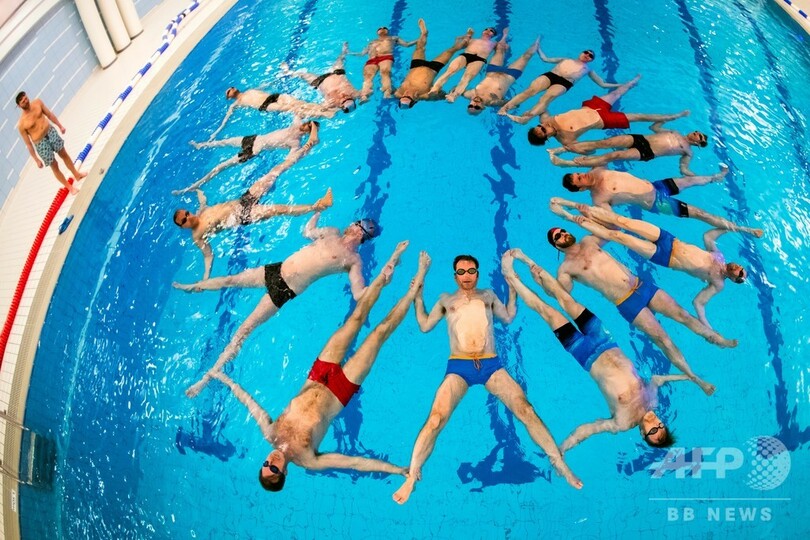 【6月5日 AFP】スウェーデン・ストックホルムのプールで練習を行う「ストックホルム男性アーティスティックスイミング(Stockholm Simkonst Herr)」のメンバー。はげ頭、太鼓腹にひげ面、地元の仲間同士で結成した40代男性のグループは、この競技の先駆者であると同時に、競技の既成概念に挑み、話題を集めている。(c)AFP
