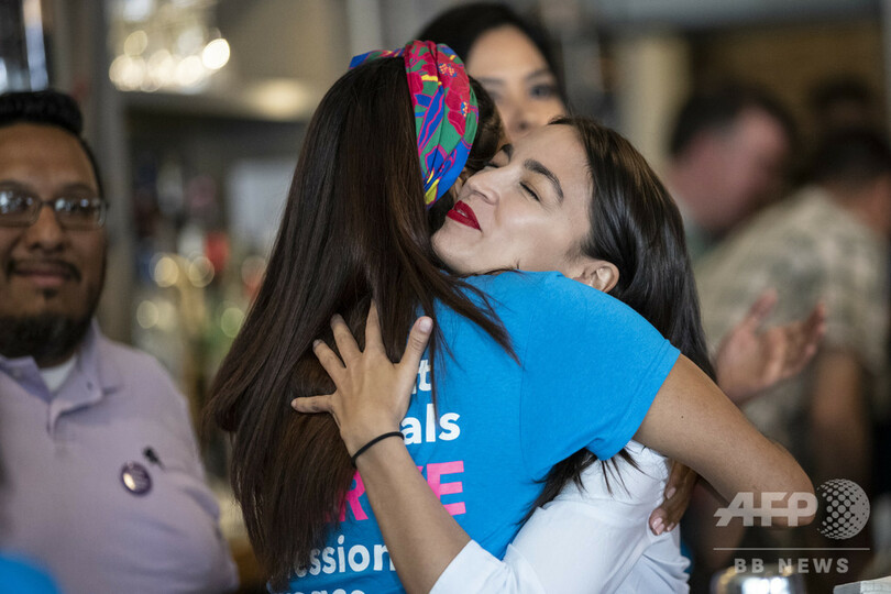 オカシオコルテス氏は、米中間選挙に向けた昨年6月のニューヨーク州民主党公認候補の予備選当初から特権階級とは無縁な経歴を利用し、下院議員11期目を目指していた民主党の重鎮に勝利。全くの無名候補者から、一夜にして米東部の人気者となった。その後はファッション誌「ヴォーグ(Vogue)」に取り上げられ、トーク番組にもゲスト出演。スター並みの知名度を生かし、全米を飛び回って反体制派候補らの応援に駆け付けてもいる。(c)AFP